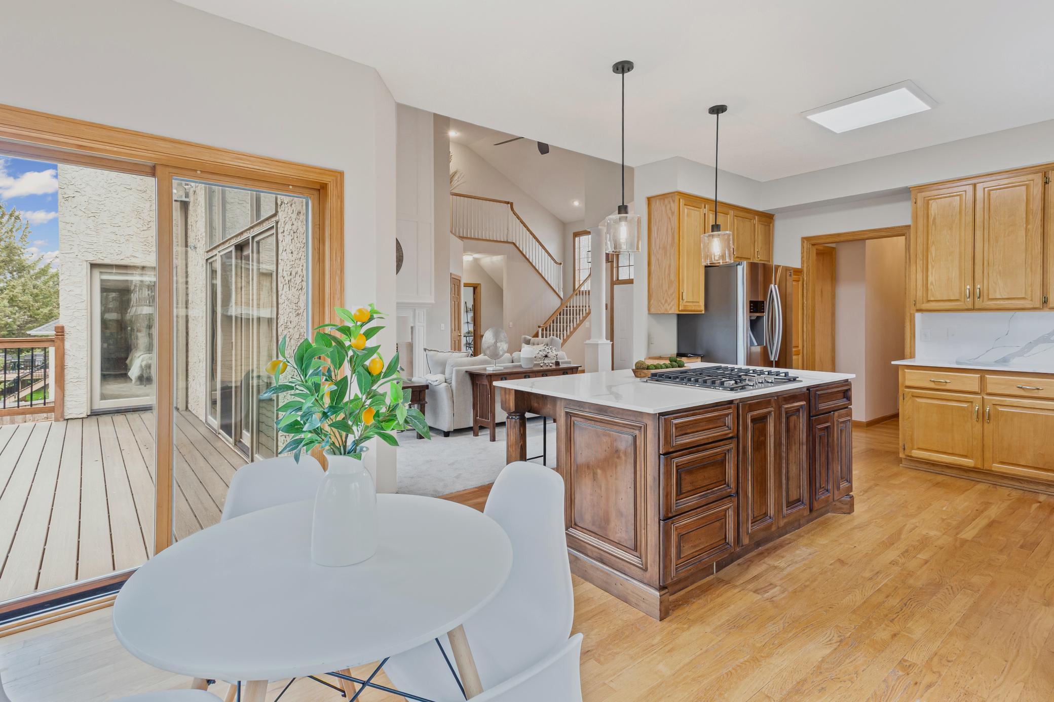 At the center of the home, the kitchen blends style and function with crisp quartz countertops, a sleek backsplash, and stainless appliances including a built-in oven, cooktop, and modern range hood. Its open layout flows into the informal dining area and out onto a maintenance-free Trex deck, making it easy to transition from family dinners to effortless entertaining.