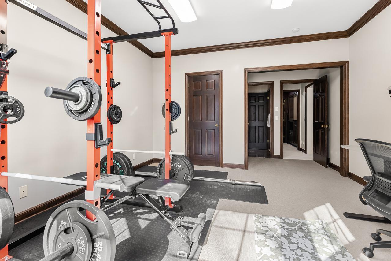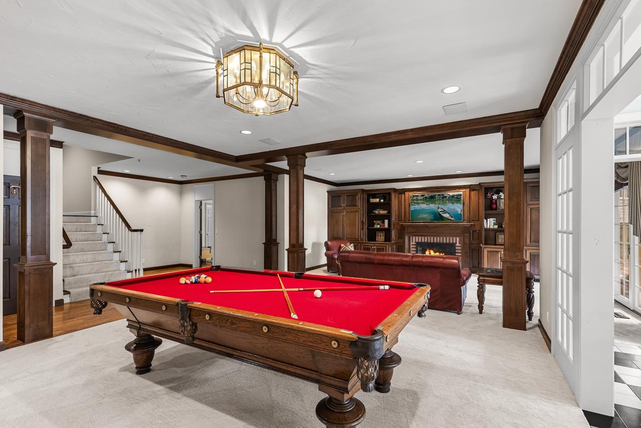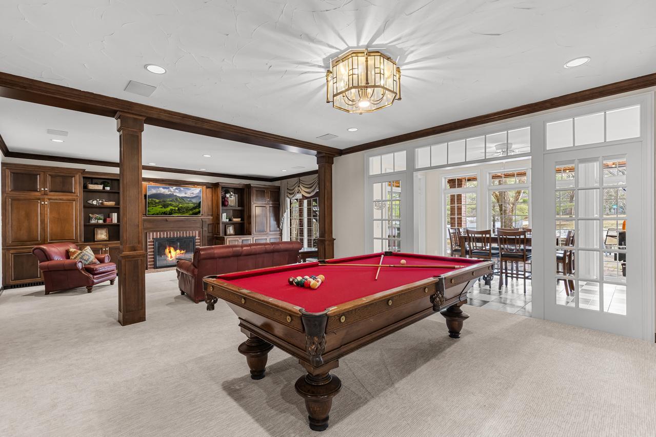 The walkout lower level offers exceptional additional living space with two bedrooms, including one with a private ensuite full bath and another with walkthrough access to a 3/4 bath. The lower level also features a spacious family room with built-in shelving, a wet bar, and ample space for a game or recreation area, along with a bright sunroom with patio doors leading outdoors.