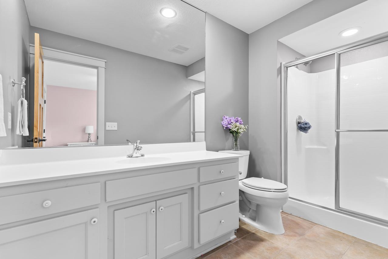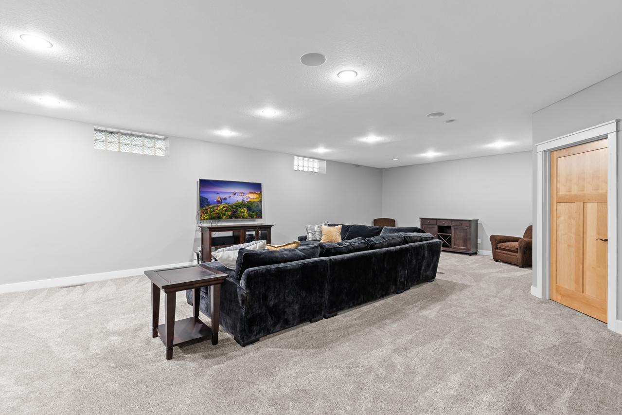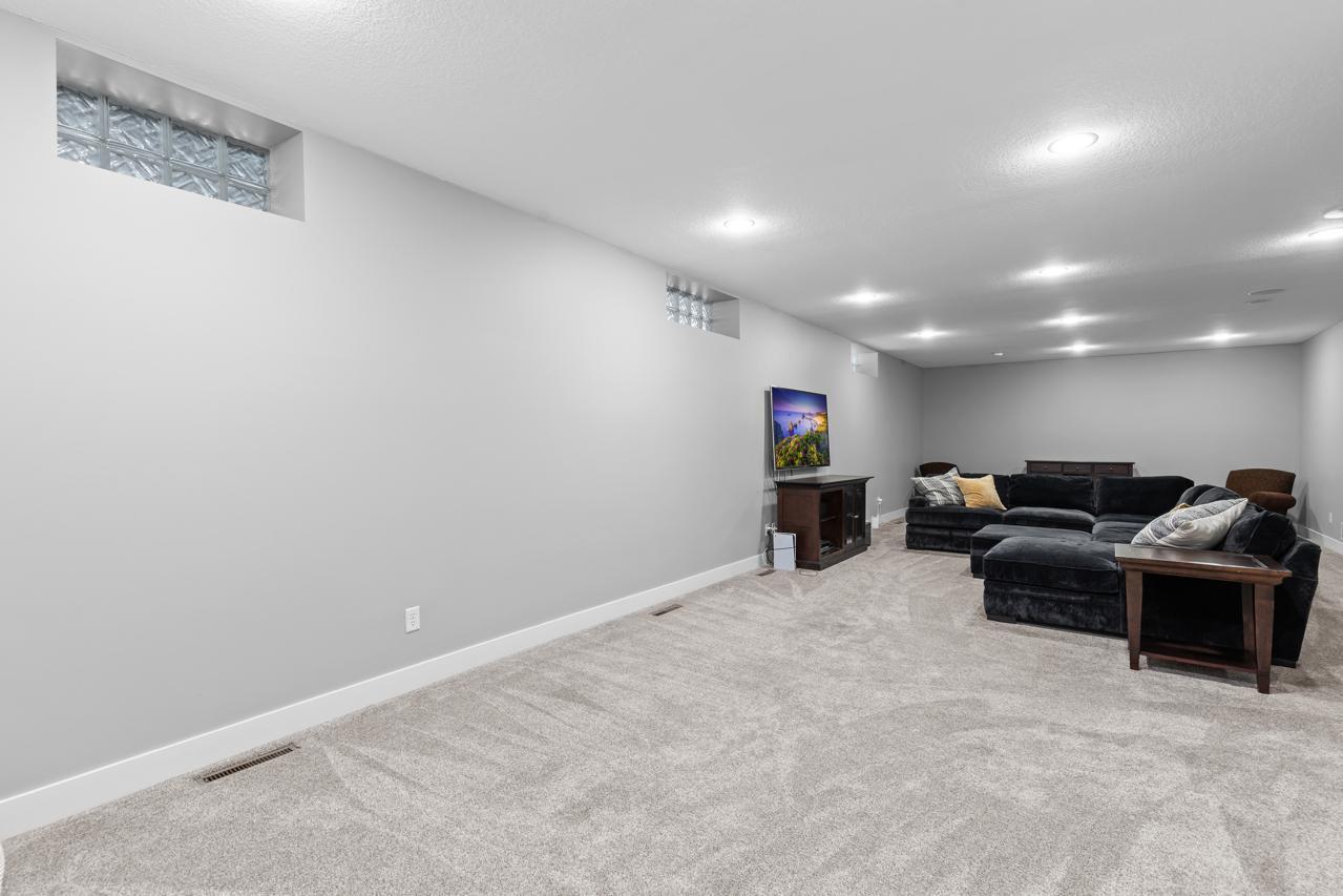 The finished lower level with 8.5-foot ceiling height provides even more living space with a large family room, an additional bedroom with generous closet space, and a stylish 3/4 bath with oversized shower, repainted cabinetry & updated toilet & sink--ideal for guests or extended living. You'll also love the home theater system with speakers - perfect place for a movie night or to watch the big game!