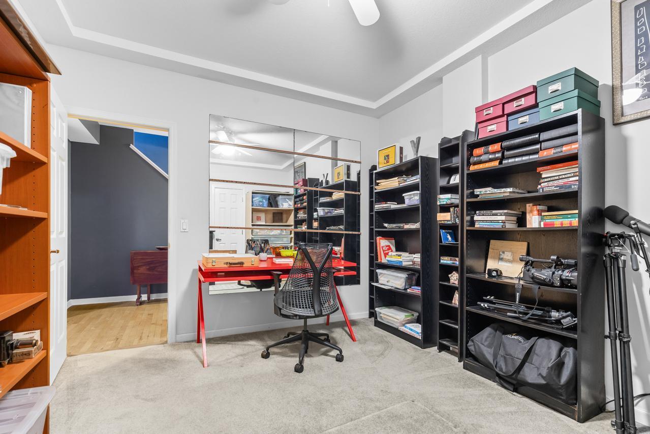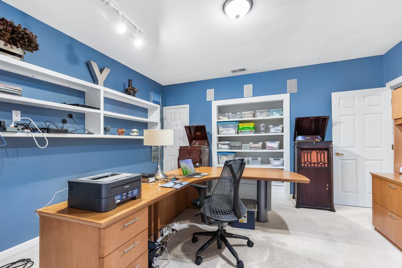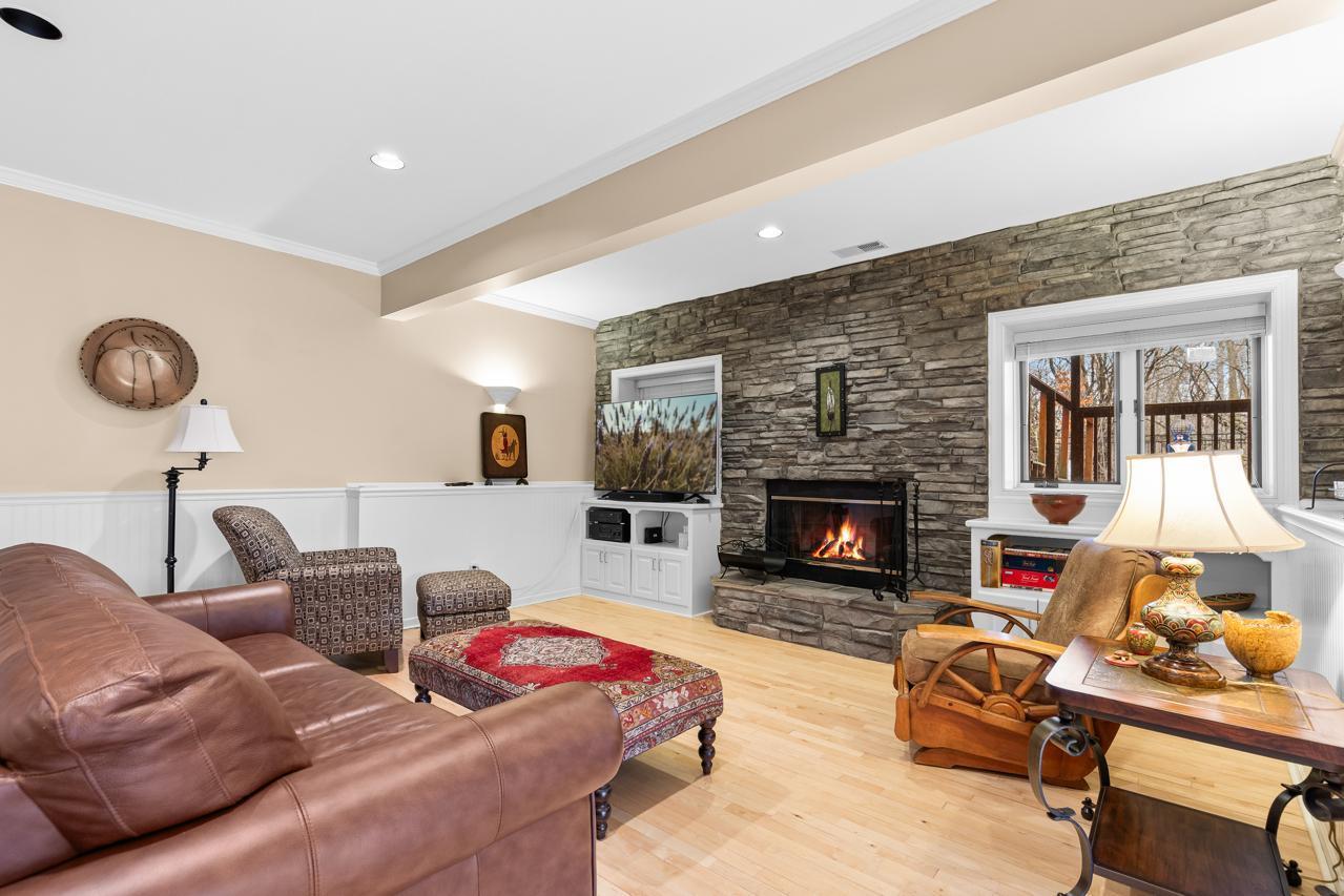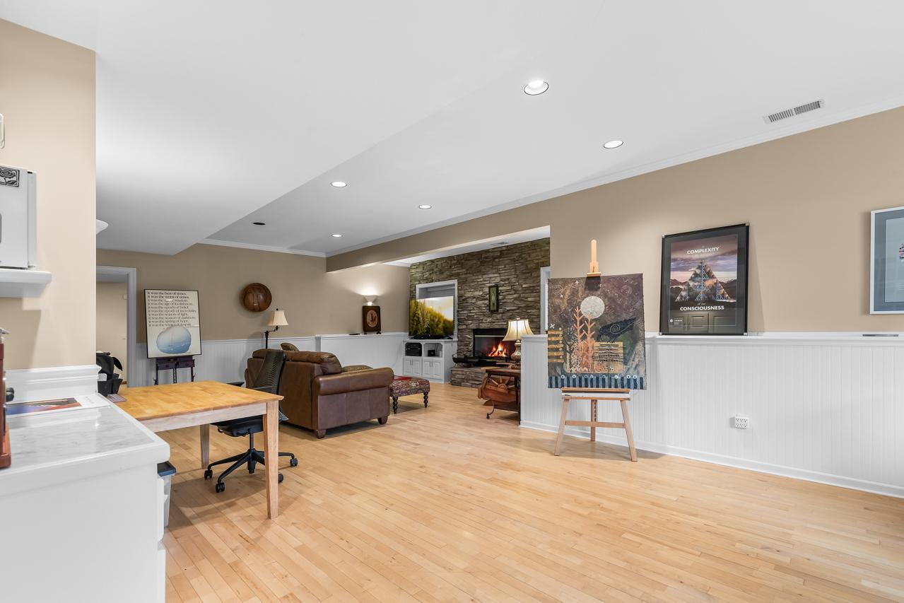The finished lower level offers high ceilings, maple floors, a large family room with cozy wood-burning fireplace, built-ins, a spacious bedroom, French-door executive office, mirrored library/workout room, cedar-lined closet, and an expansive utility/workshop space.