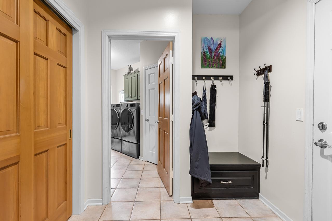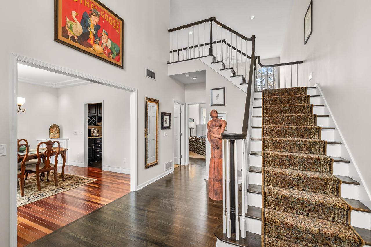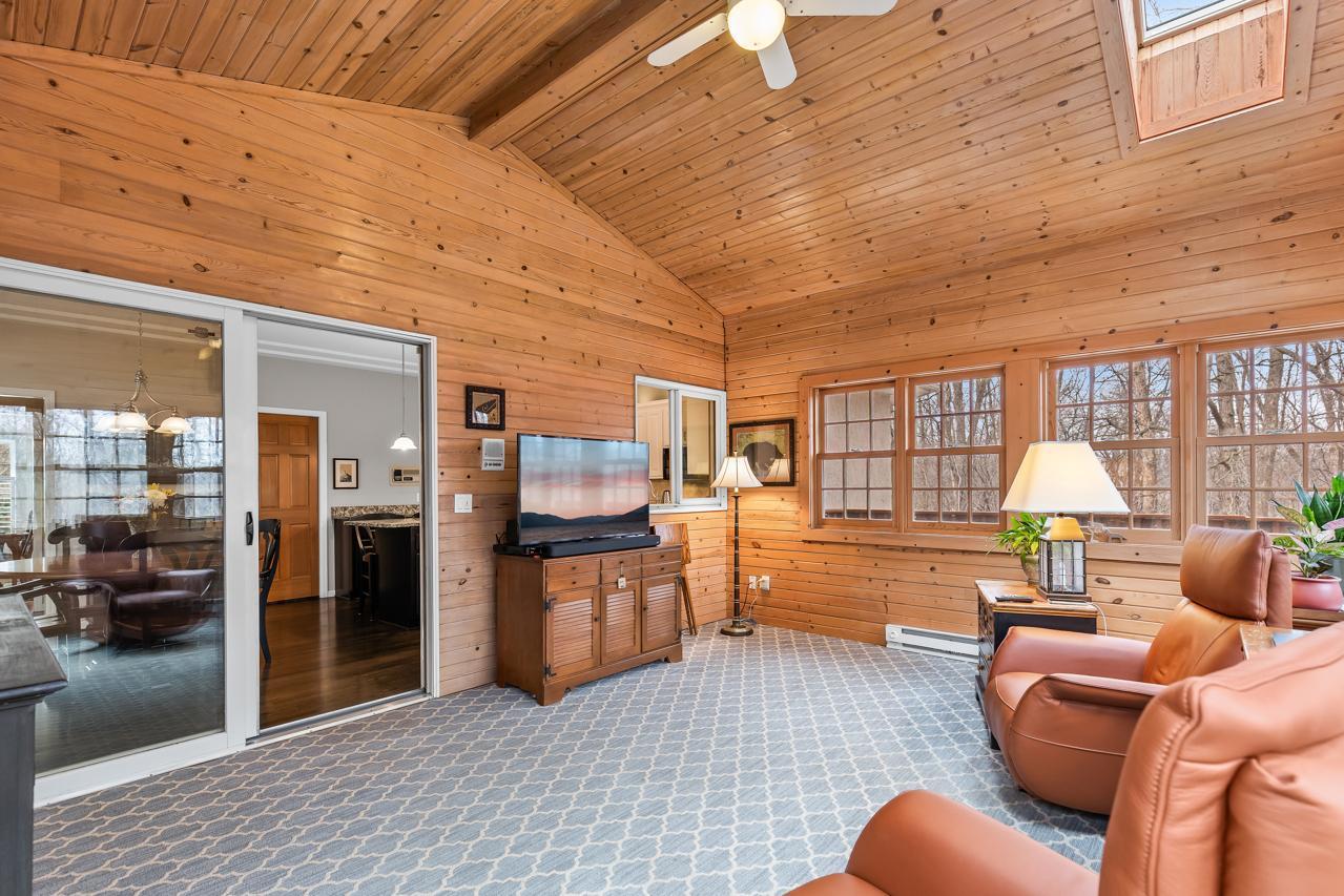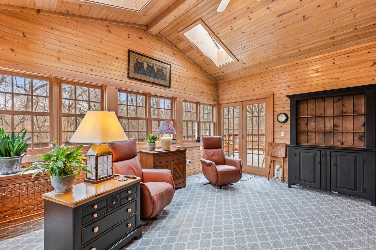 Inside, a dramatic sunlit two-story entry and great room welcome you with soaring vaulted ceilings, extensive built-ins, and rich hardwood floors. The main level showcases a highly sought-after private primary suite with walk-in closet, spa-like bath with jetted tub and walk-in shower, and direct deck access. Entertain effortlessly in the formal dining room with cherry floors, elegant butler's pantry, wet bar, and a spacious chef's kitchen featuring stainless appliances and a large granite center island. Additional highlights include a knotty pine sunroom with skylights, inviting gas fireplace living room, oversized mudroom/laundry, and a spacious three-car garage. A hidden fitness center with heated jetted hot tub adds a rare luxury feature.