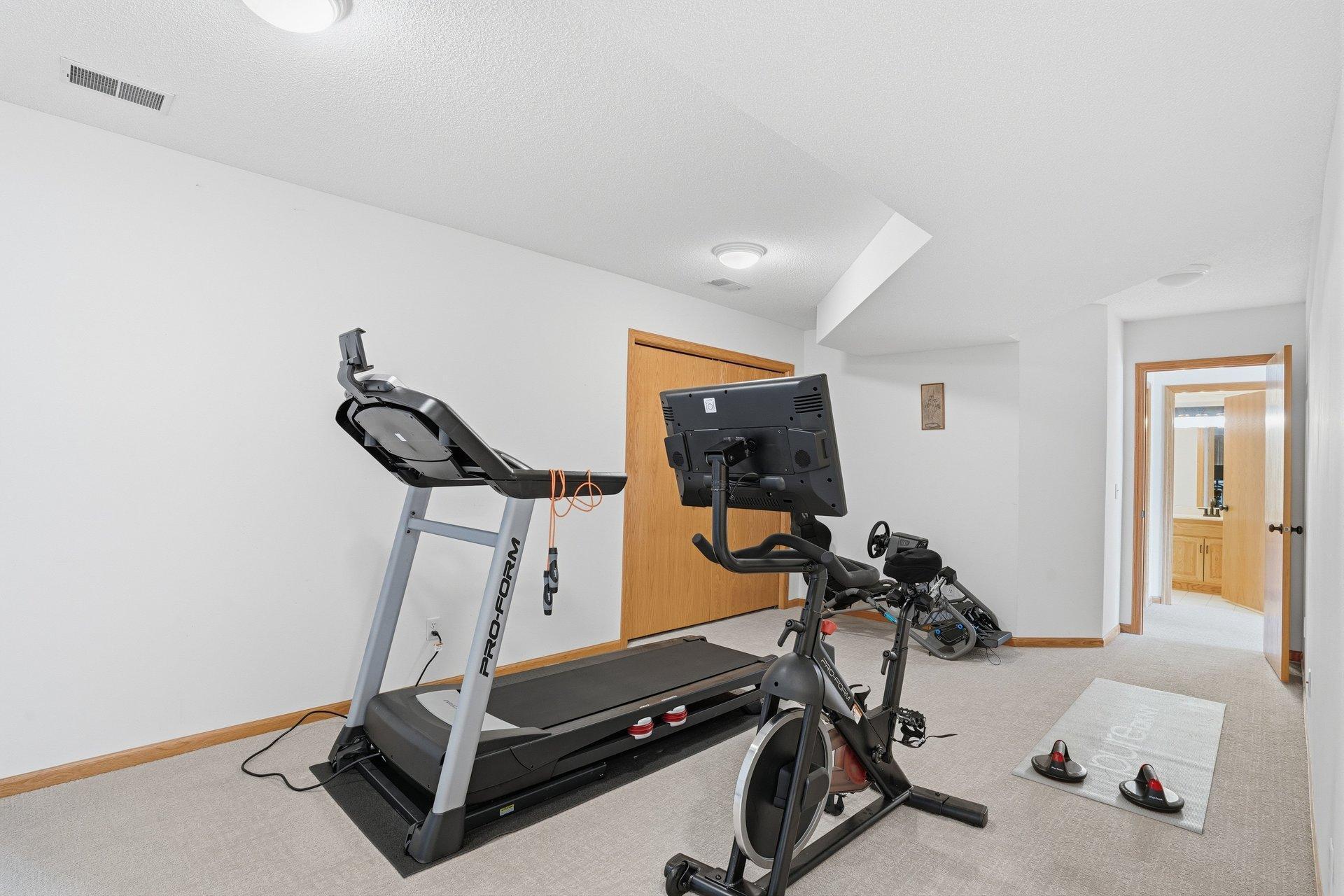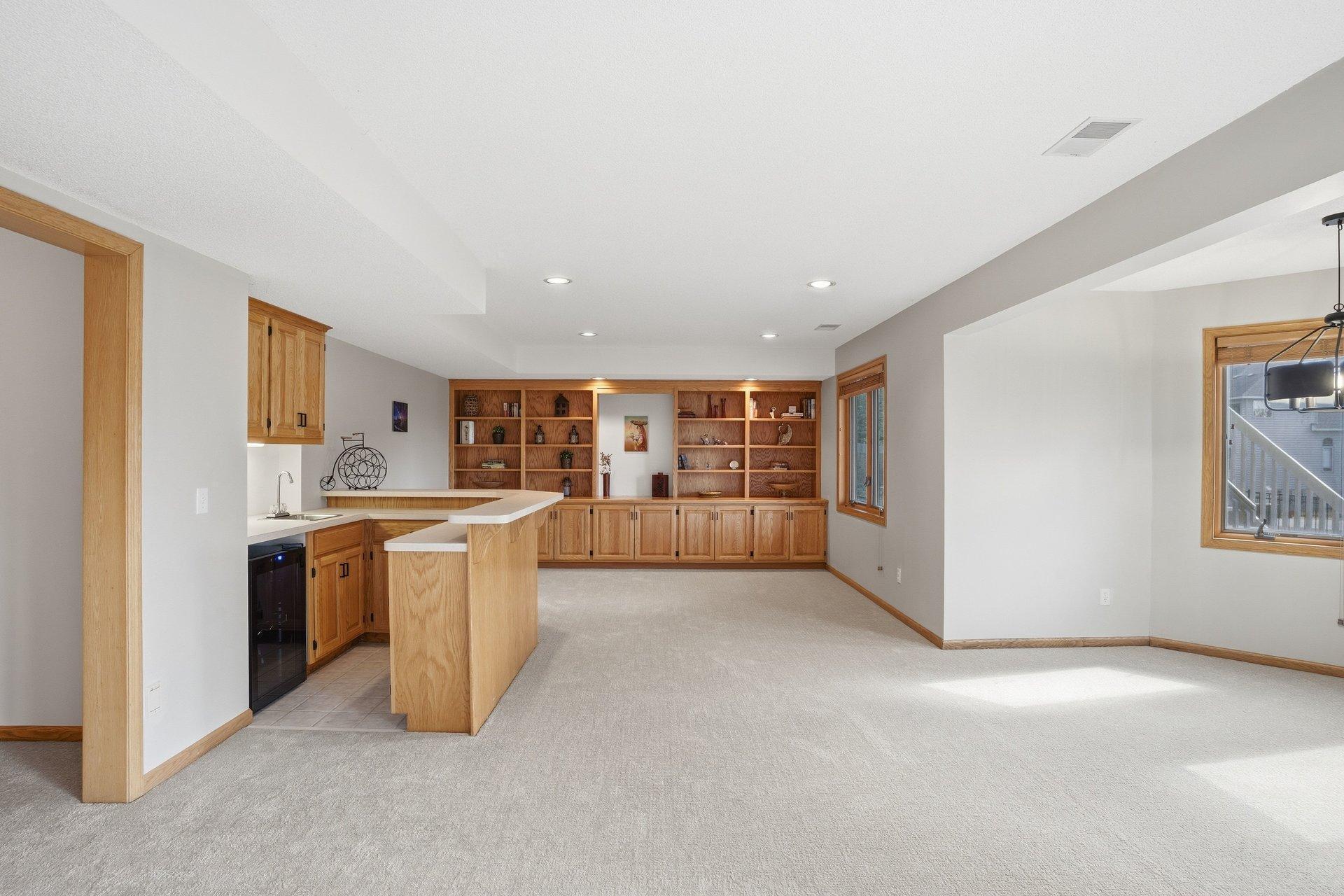 The walkout lower level is designed for relaxation and hosting, featuring custom built-ins and a wet bar. A private lower-level bonus room and full bathroom.