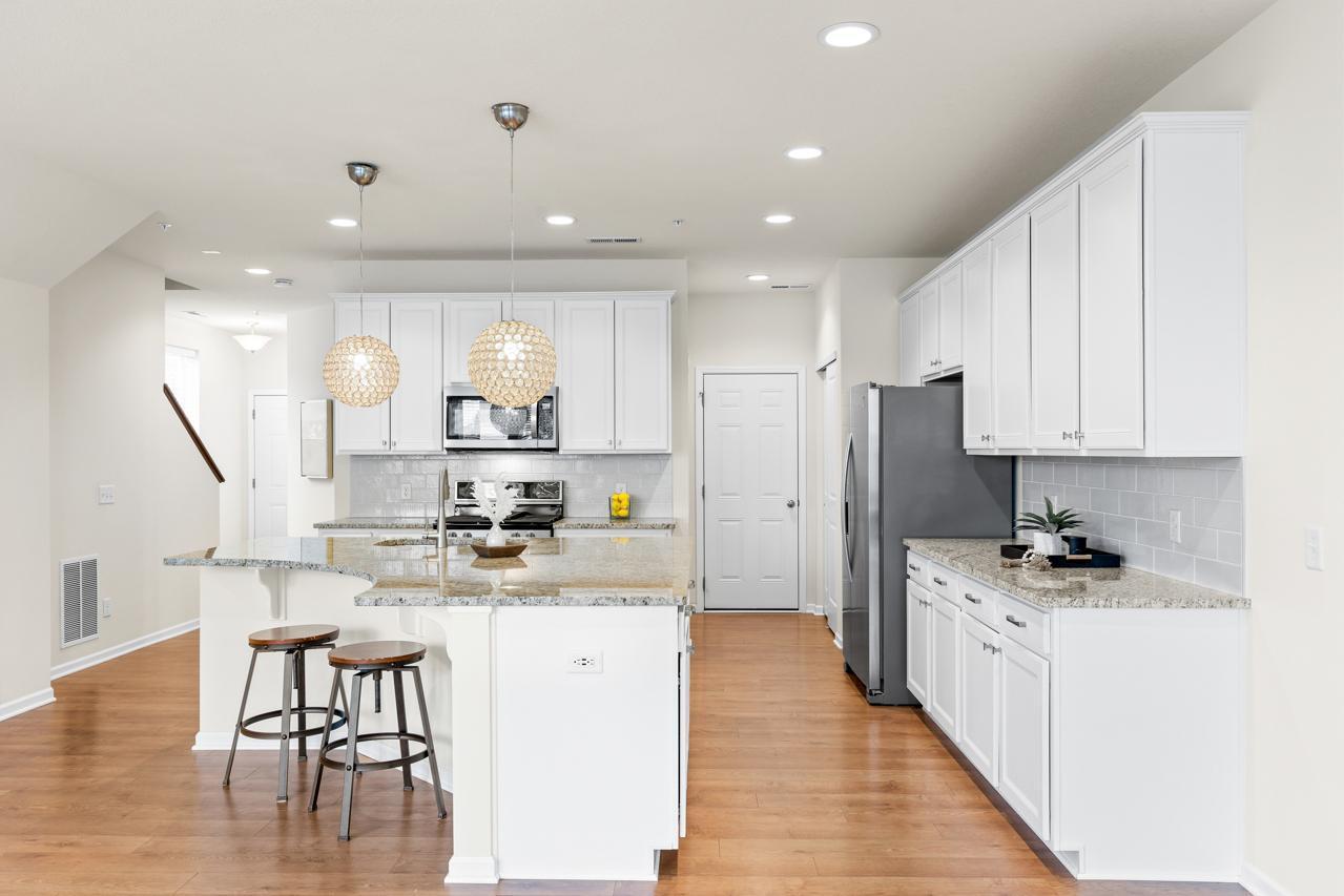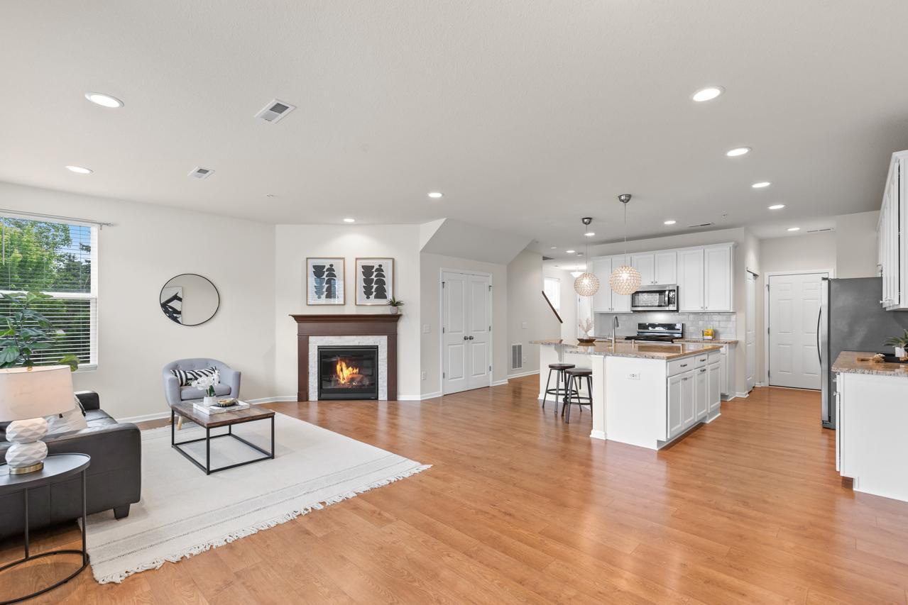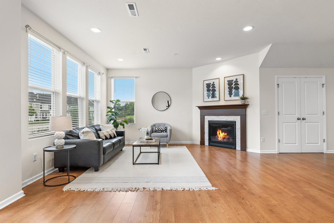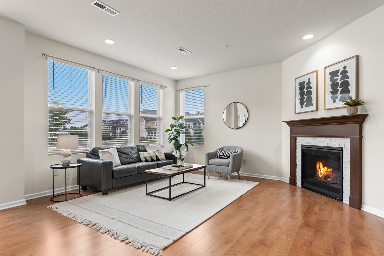 Move-In Ready End-Unit Townhome in Prime Chanhassen Location! Built in 2019, this stylish and spacious 3-bedroom end-unit townhome offers a blend of comfort and quality finishes in a location that can't be beat. Enjoy a beautifully upgraded interior featuring a marble fireplace, rich teak railings, custom pull-out kitchen cupboards, and designer light fixtures throughout. The bright and airy sunroom is the perfect spot to unwind year-round. All three bedrooms are conveniently located on the upper level. Tucked in a friendly community with its own firepit and scenic pond, and just minutes from downtown Chanhassen, Lake Susan, and miles of picturesque walking trails. Quick access to Hwy 212 makes commuting a breeze. This is low-maintenance living at its finest!
