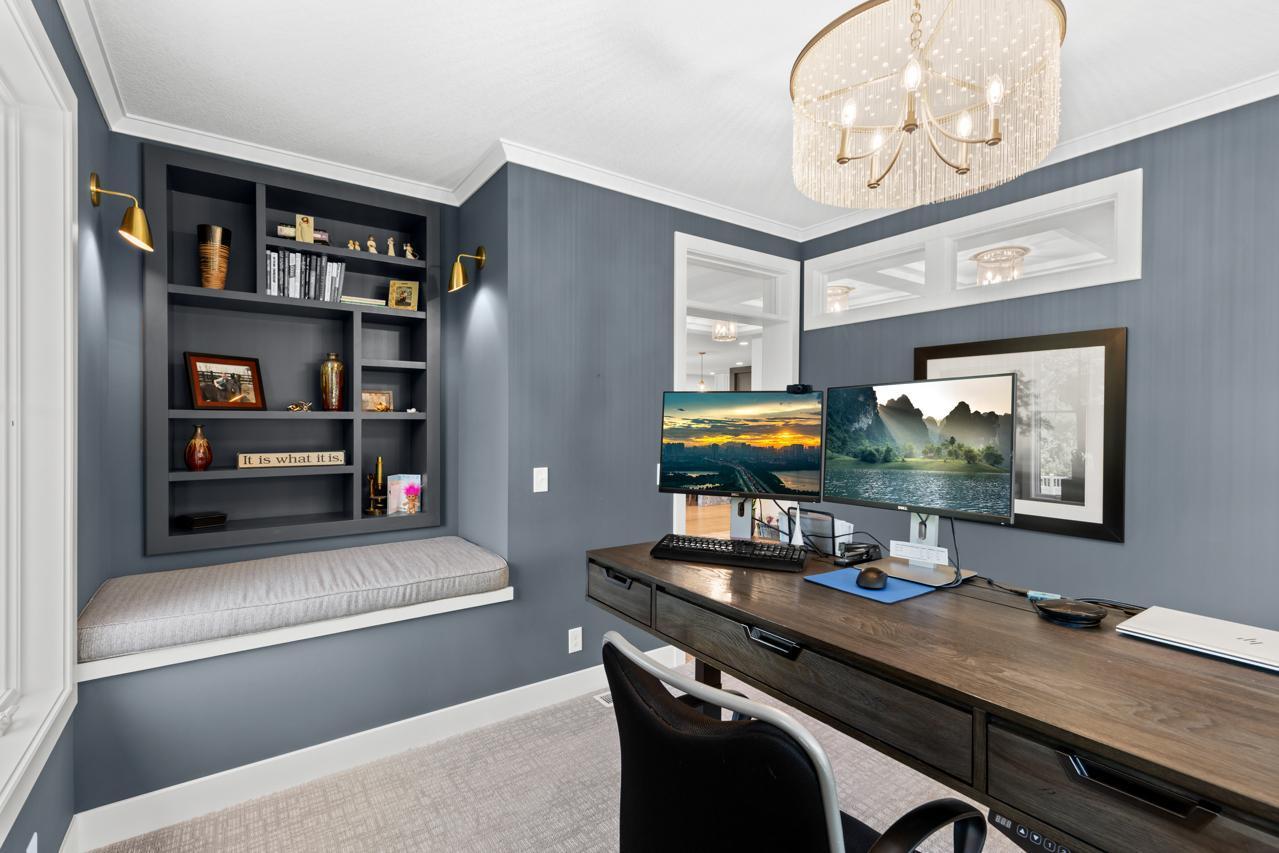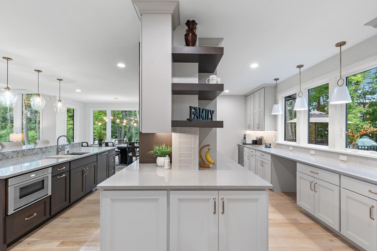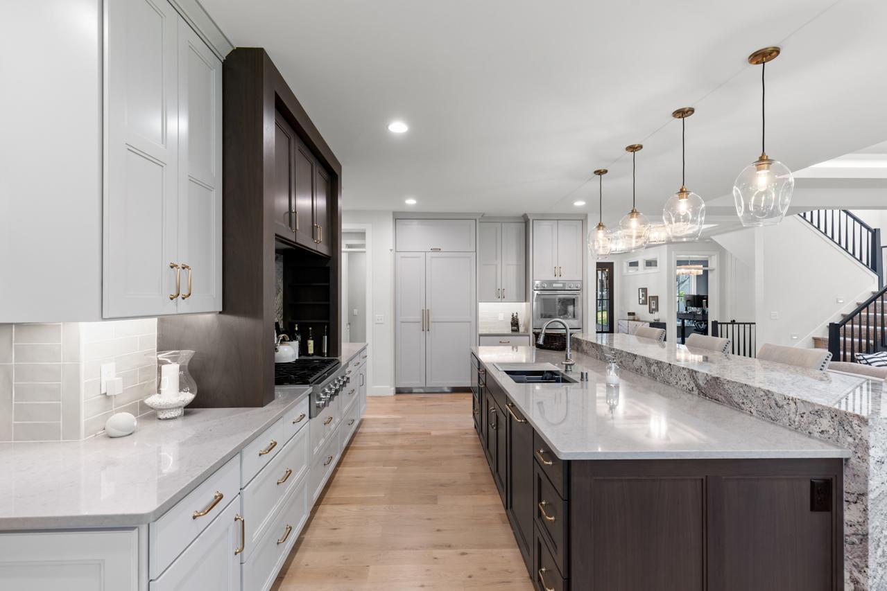 Step inside to discover custom Walnut and enameled cabinetry, a striking Cambria kitchen island with a raised 11-foot granite counter, Thermador appliances, and a walk-through pantry complete with built-in pocket office and floating shelving. The wire-brushed solid Oak flooring adds warmth and sophistication, while Anderson 400 series windows flood the home with natural light.