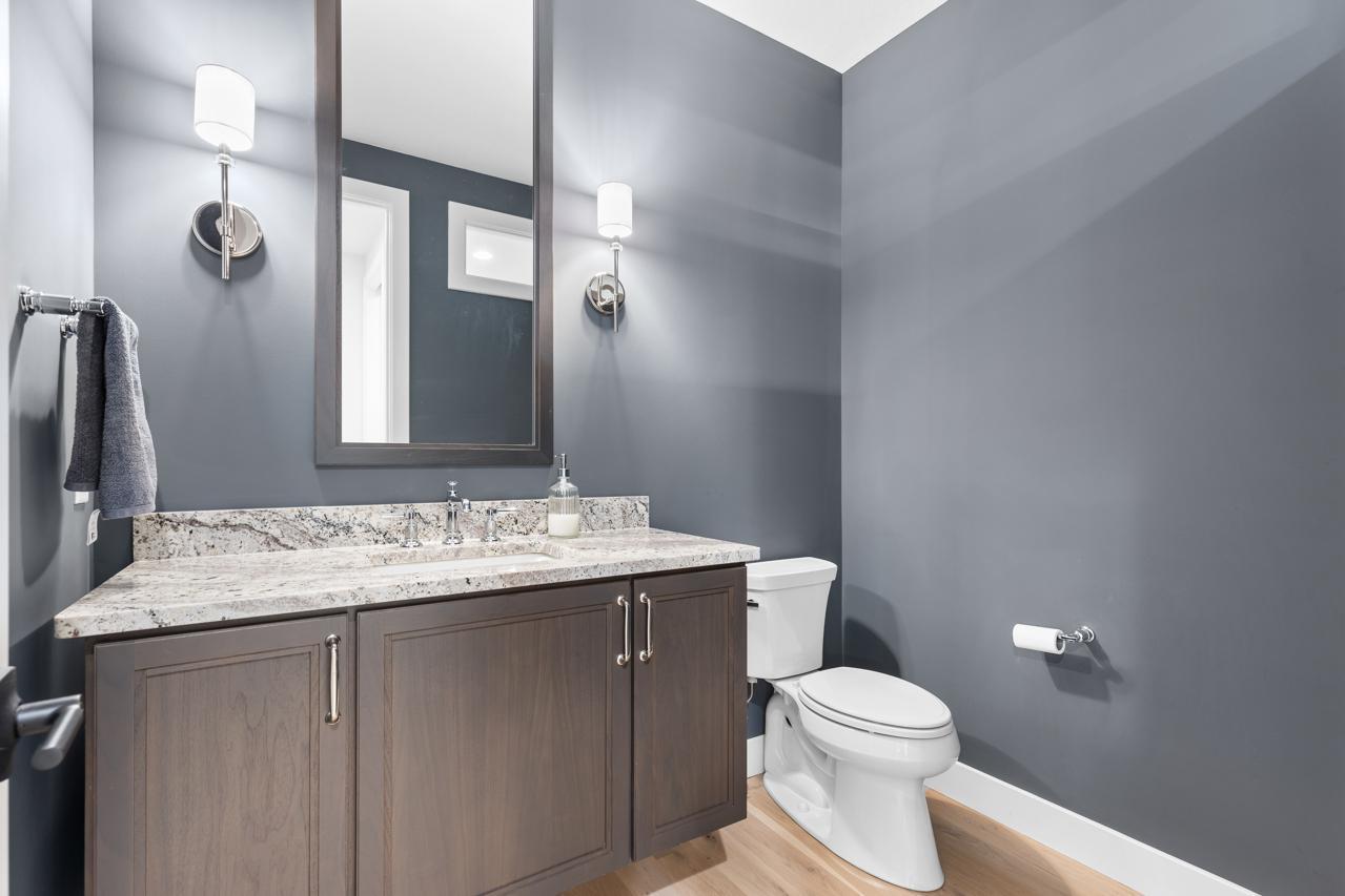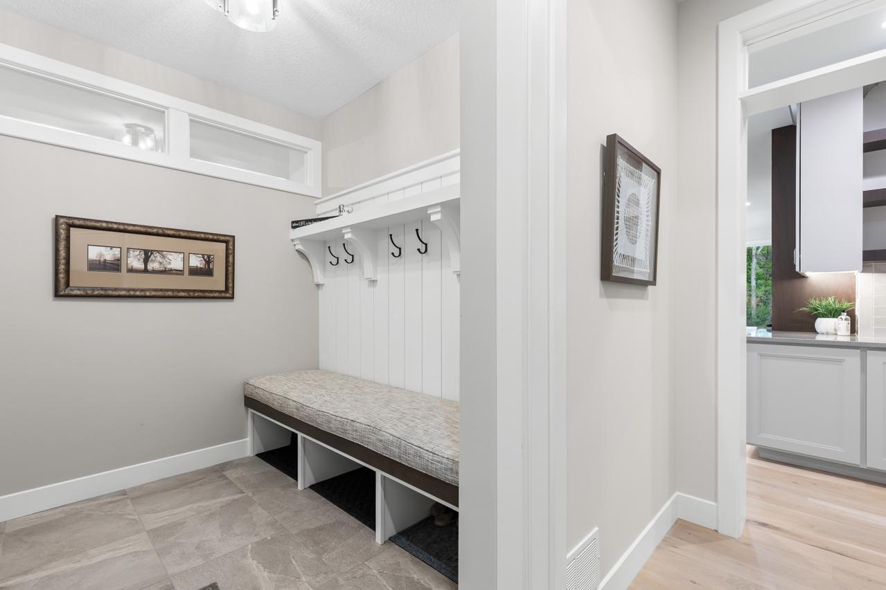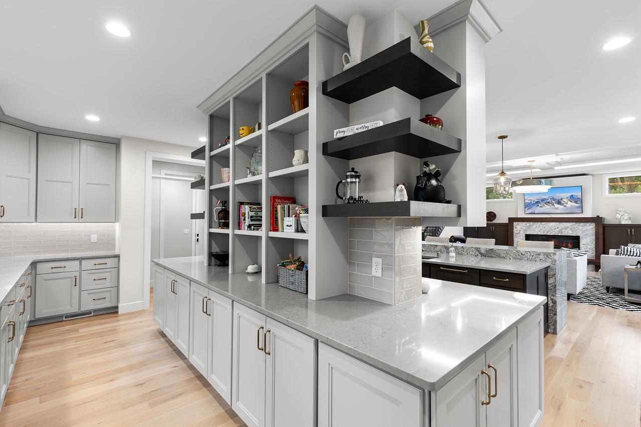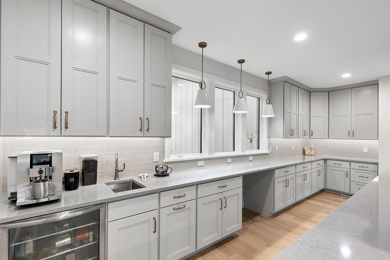 Step inside to discover custom Walnut and enameled cabinetry, a striking Cambria kitchen island with a raised 11-foot granite counter, Thermador appliances, and a walk-through pantry complete with built-in pocket office and floating shelving. The wire-brushed solid Oak flooring adds warmth and sophistication, while Anderson 400 series windows flood the home with natural light.