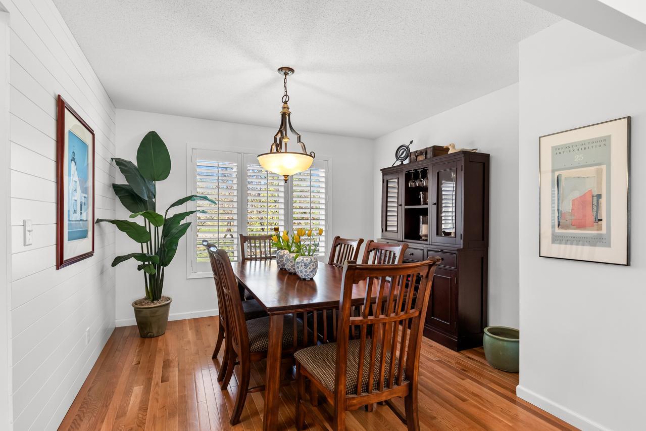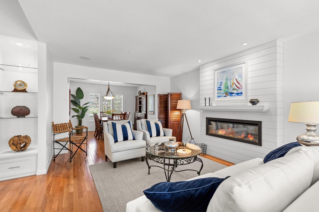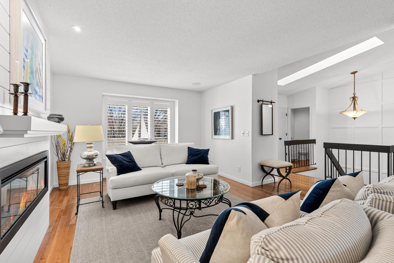 A charming front porch patio welcomes you into a bright, warm and inviting interior where soaring vaulted ceilings, two skylights and abundant natural light create an open, airy feel. Gleaming hardwood floors span the main level, complemented by beautiful plantation shutters and timeless charm throughout.