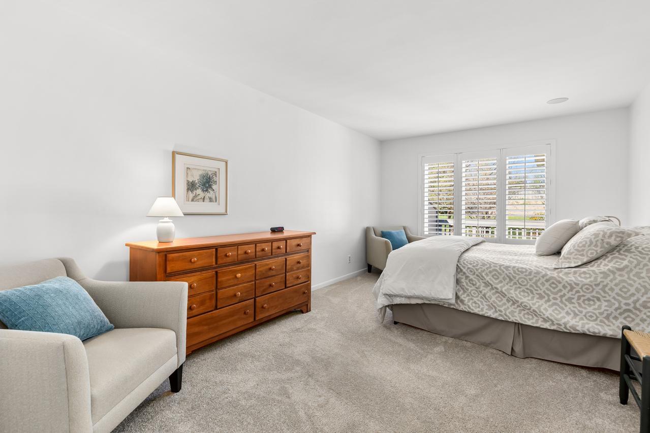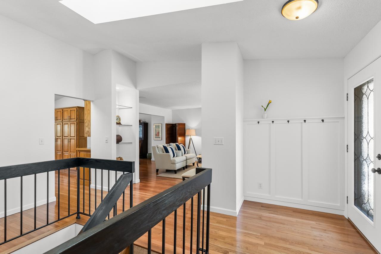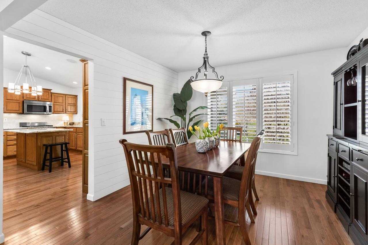 A charming front porch patio welcomes you into a bright, warm and inviting interior where soaring vaulted ceilings, two skylights and abundant natural light create an open, airy feel. Gleaming hardwood floors span the main level, complemented by beautiful plantation shutters and timeless charm throughout.