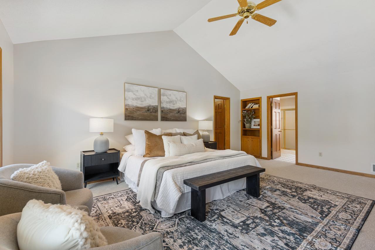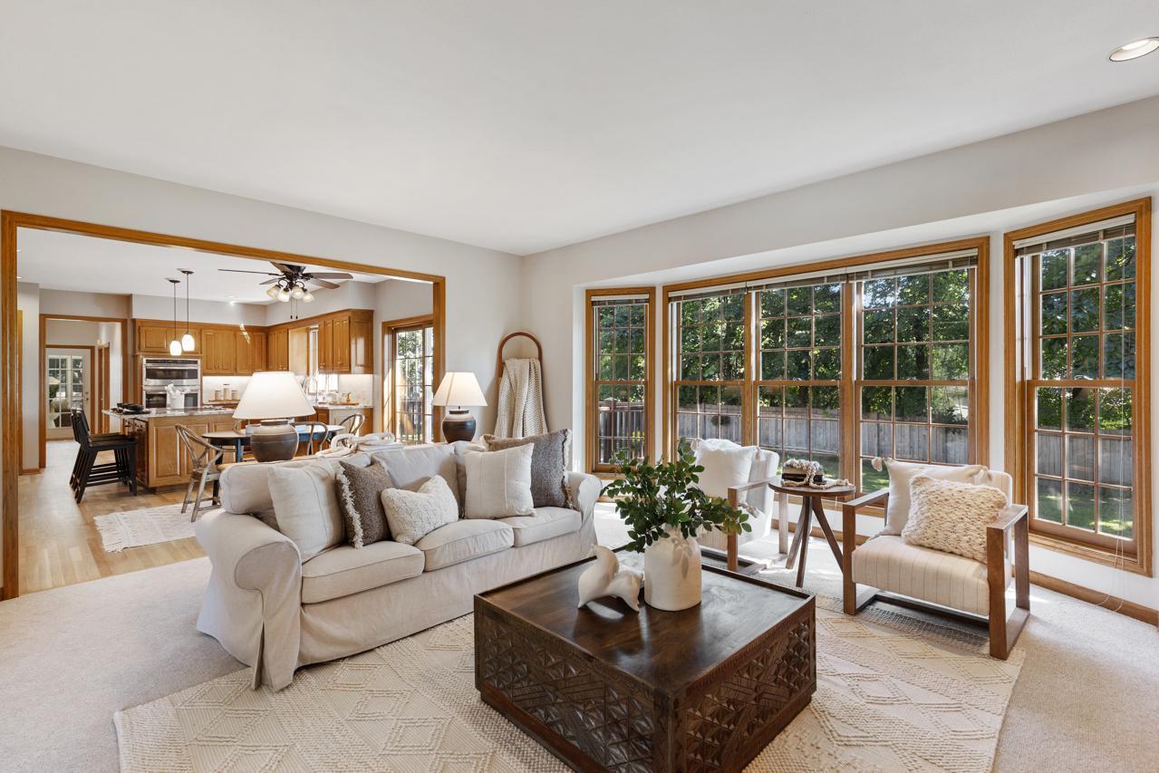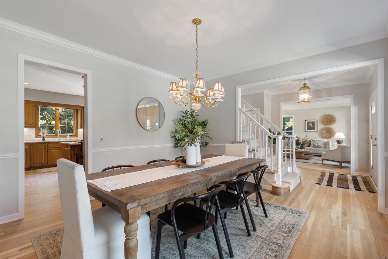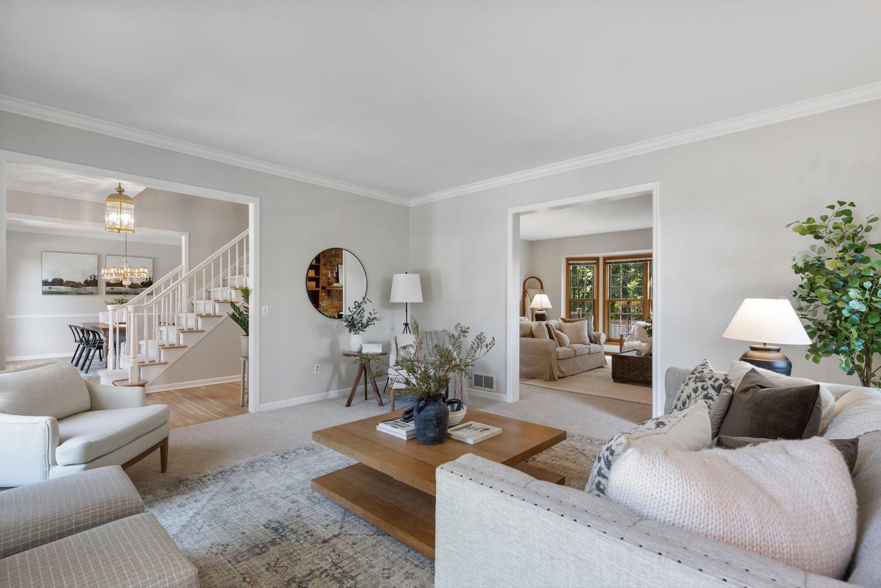 The primary bedroom suite offers a serene, relaxing ambiance with a luxurious ensuite bath. The additional three bedrooms provide flexibility for various uses, such as a home office or guest suite. The spacious lower level includes a bar and a non-conforming 5th bedroom with an additional bath. This home's open layout, paired with its inviting outdoor spaces, creates a warm and welcoming living experience.